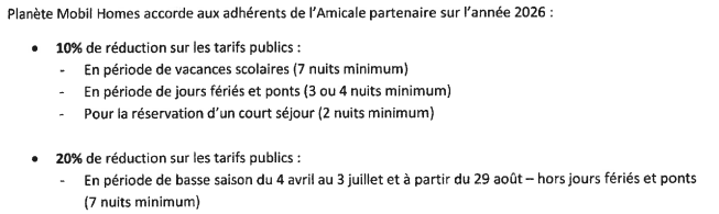 -10% sur les prix publics + Frais de réservation offerts, auxquels s'ajoutent l'aide de l'Amicale